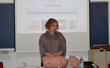 Otomatik eksternal defibrilatör (OED) cihazının ilkyardım uygulamalarındaki kullanımı, Yunus Emre Sağlık Hizmetleri Meslek Yüksekokulu tarafından düzenlenen seminerde uygulamalı olarak